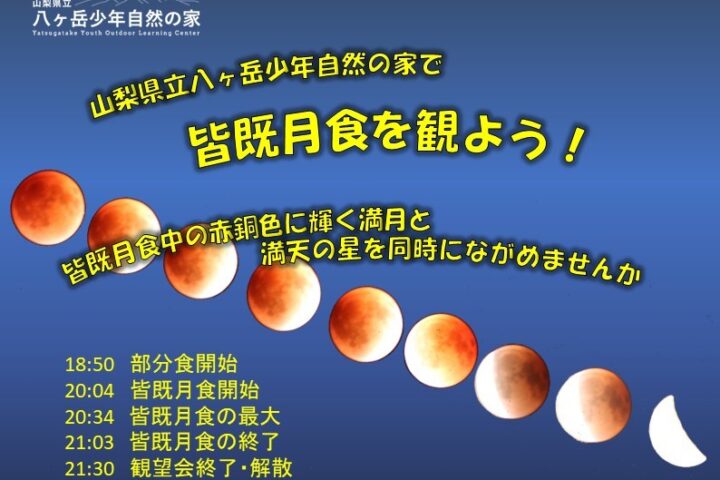 今年度2回目の皆既月食の天体ショー。夜空がきれいに望める「八ヶ岳少年自然の家」の中庭で、刻々と変化する皆既月食時の月を眺める機会を提供します。