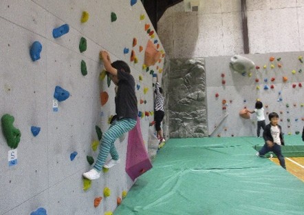 体育館に設置された壁を、ホールドを使って横伝いに壁を進みます。 使うホールドの色を指定したりコースを選んだりするなど、難易度に合わせて実施することができます。