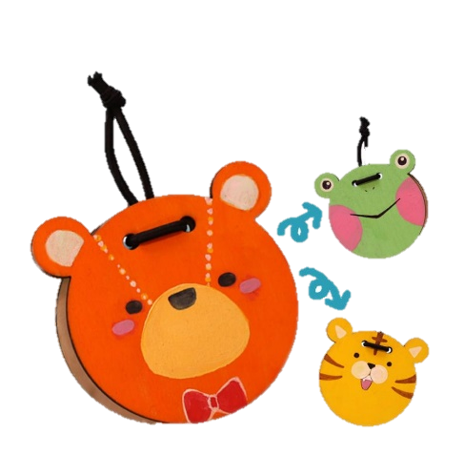 カット加工された木の板から部品を抜いて、自由に色を塗り、組み立ててカスタネットを作ります。