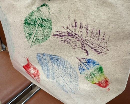 集めてきた葉っぱを使ってスタンプを作成し、オリジナルのトートバッグを作る。