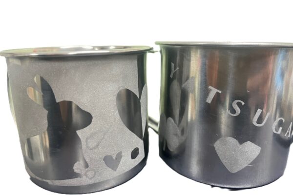 研磨剤を吹き付けて、飲み物ボトルの表面に模様を刻みます。※自然の家では、フタ付きプラスチックボトルを使用します。