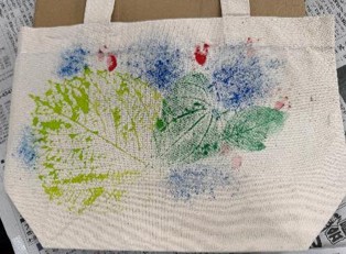 集めてきた葉っぱを使ってスタンプを作成し、オリジナルのトートバッグを作る。