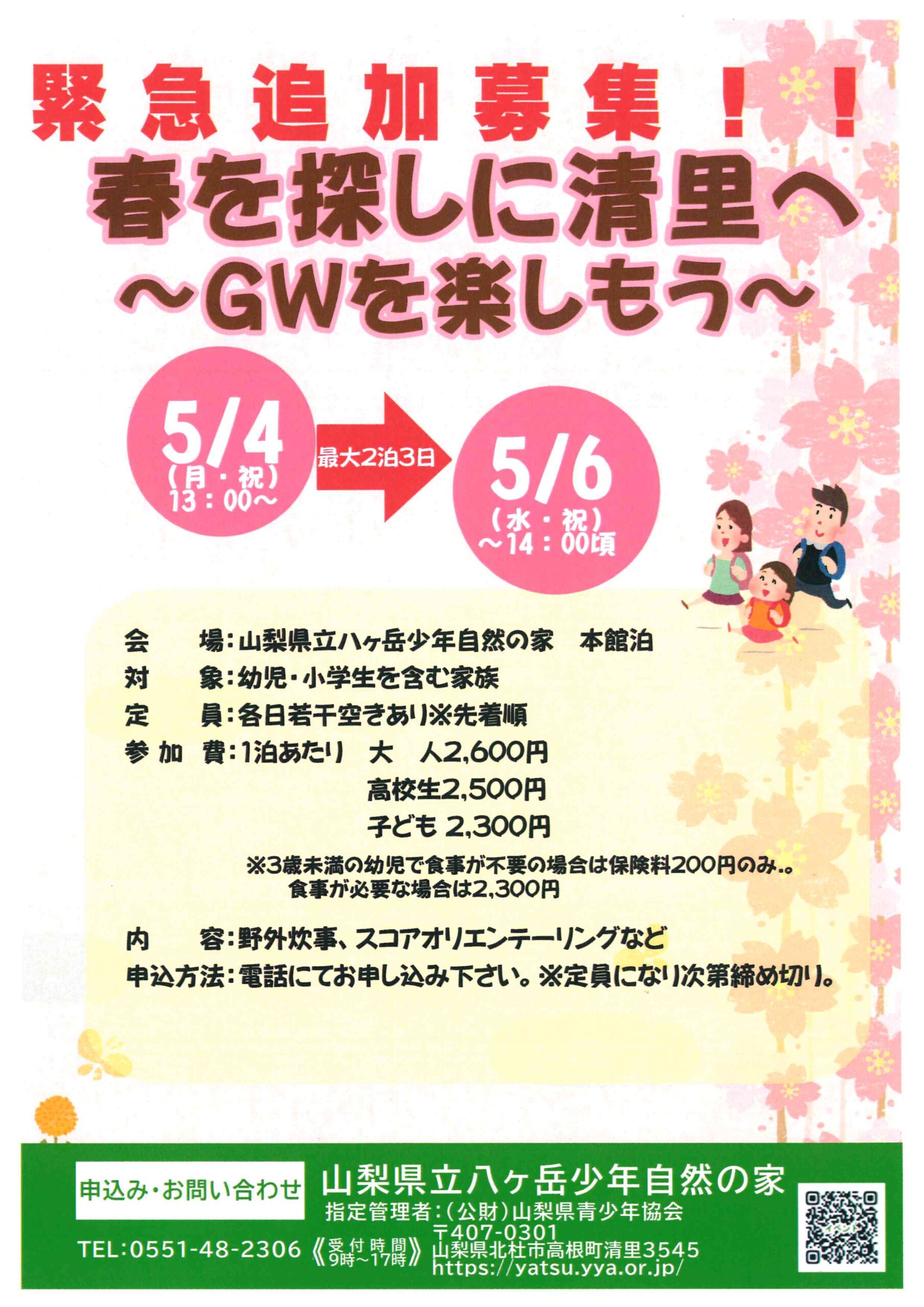 ◆目 的:ゴールデンウィーク中に、家族で自然の家に宿泊し活動プログラムを体験してもらうことで自然の家への理解を深めつつ、家族の交流や心身のリフレッシュを図る機会としてもらう