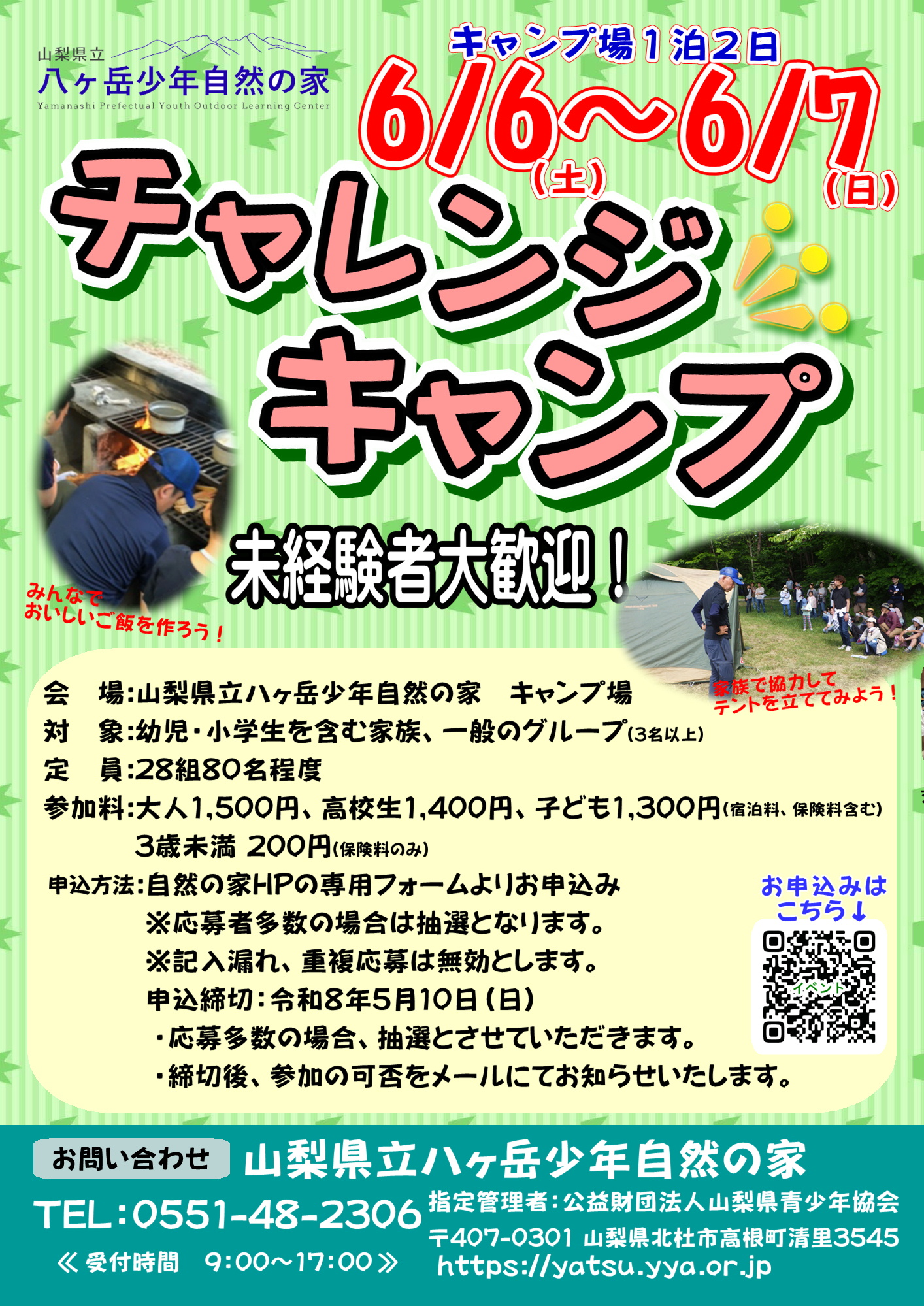 ◆目 的:キャンプに挑戦したい家族や一般のグループが気軽に参加し、自然の中で協力してキャンプ生活を送ることで、コミュニケーションを深め、より良い関係を構築する機会とする